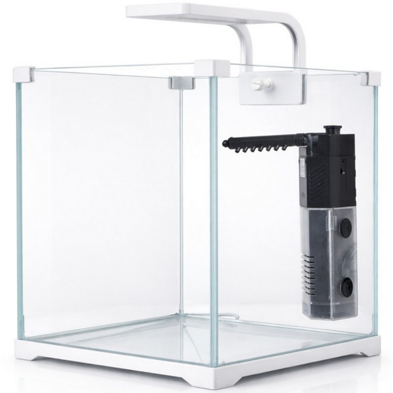 Благодаря компактным размерам аквариум легко разместить дома, в офисе, на столе, тумбе или комоде. Белый цвет основания и элементов оформления придает комплекту аккуратный, светлый и современный вид, который хорошо вписывается в различные интерьеры.