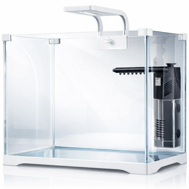 Благодаря компактным размерам аквариум легко разместить дома, в офисе, на столе, тумбе или комоде. Белый цвет основания и элементов оформления придает комплекту аккуратный, светлый и современный вид, который хорошо вписывается в различные интерьеры.