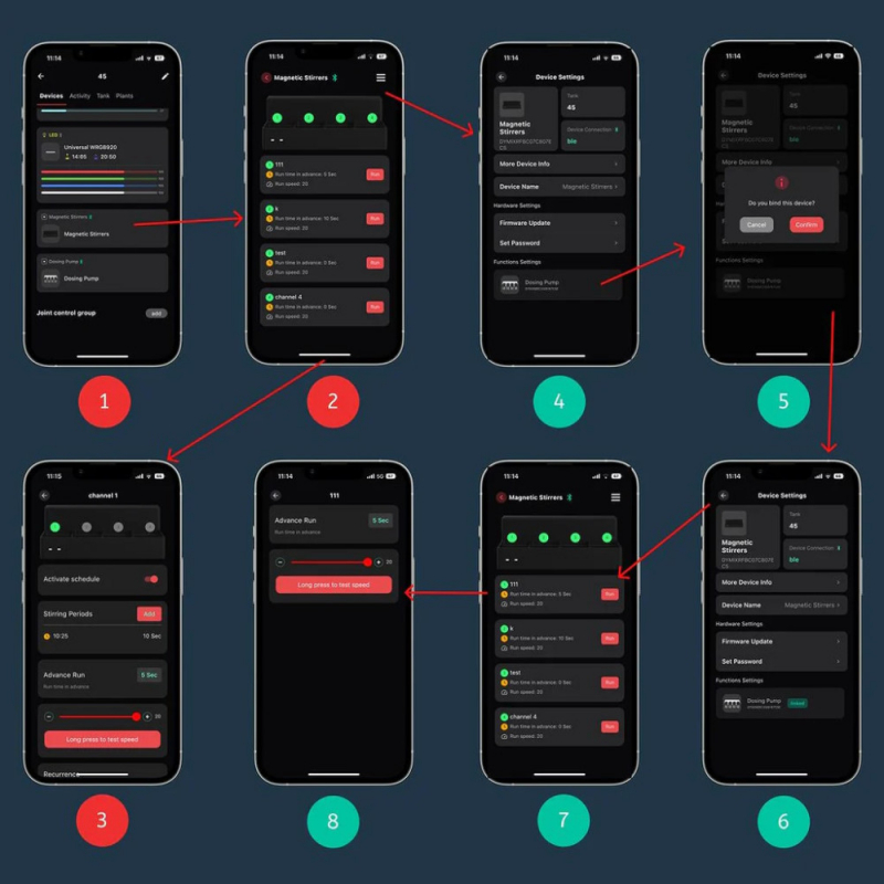 Chihiros Magnetic Stirrers используется для автоматического перемешивания жидкостных удобрений, растворенных солей и других химических веществ, которые хранятся в контейнерах для дозирования. Это позволяет избежать осаждения компонентов и обеспечить однородность дозируемых веществ.
