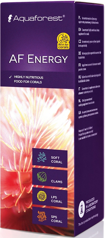 Aquaforest AF Energy 50 мл — это концентрированная добавка-корм для всех видов кораллов, особенно эффективна для SPS кораллов. Продукт создан на основе высококачественных натуральных экстрактов и имеет уникальный состав, обогащенный омега-жирными кислотами, аминокислотами, витаминами и экстрактами из зоопланктона.