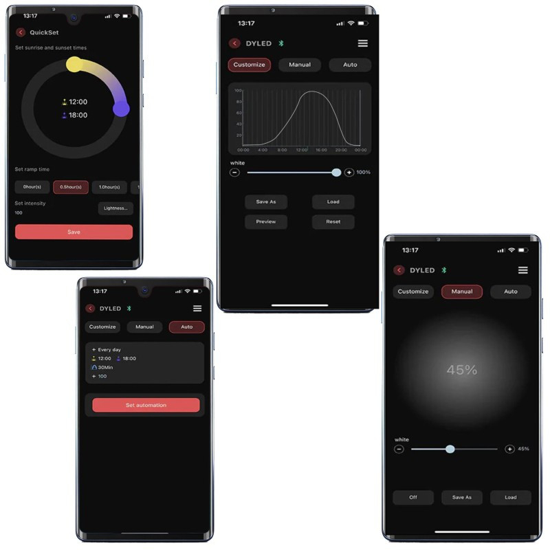 Создает плавный цикл «рассвет-полдень-закат», снижая стресс рыб и креветок.