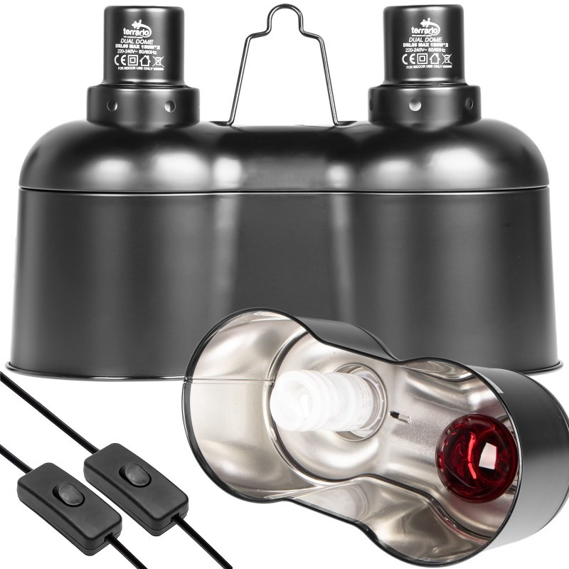 Terrario SunFusion Duo — це подвійний світильник для тераріумів, розроблений для одночасного використання нагрівальних та UVB-ламп. Оснащена двома керамічними патронами E27, окремими вимикачами та алюмінієвим відбивачем, вона дозволяє створити ідеальні умови освітлення й обігріву для рептилій, амфібій та інших екзотичних тварин.