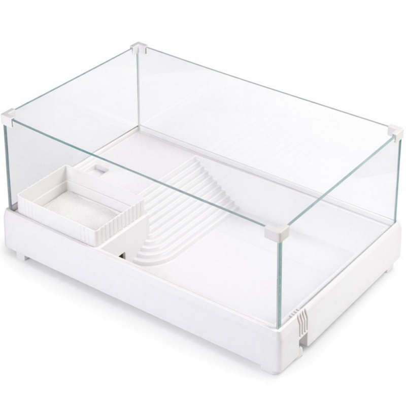 Этот террариум-аквариум предназначен для содержания небольших водных черепах. Он позволяет организовать для питомца базовую среду обитания с водной частью и сухой зоной, где черепаха может вылезти из воды, обсохнуть и отдохнуть.